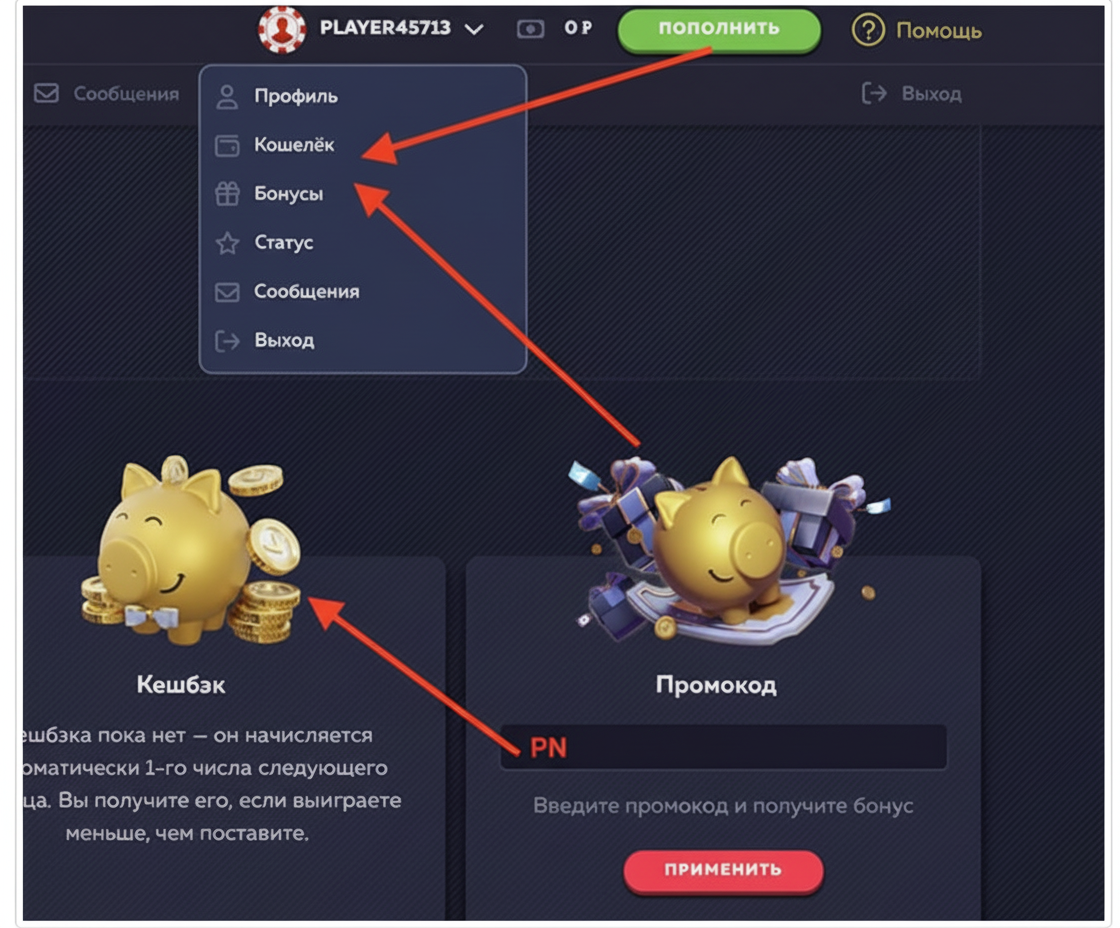 На верхней панели рядом с вашим балансом и кнопкой «Пополнить», расположился личный кабинет. Его выпадающее меню скрыто за автоматически сгенерированным никнеймом. На данный момент в него вошли следующие разделы: